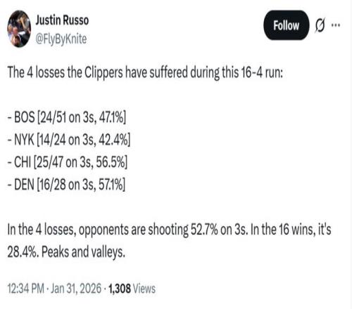 而对手三分投射的命中率也是快船队过去20场比赛的胜负手,当快船队取胜时对手三分命中率仅为28.4%,输球时对手的三分命中率则高达52.7%。